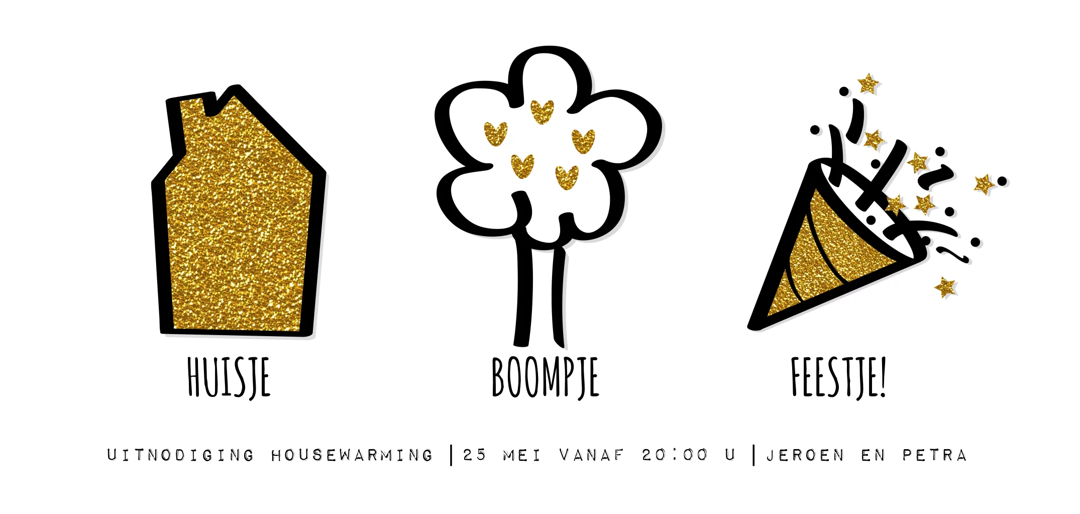Huisje boompje feestje! Trendy en originele uitnodiging voor een house warming party! Leuke, strak vormgegeven kaart met een illustratie van een huis, boom en een feesttoeter met confetti.