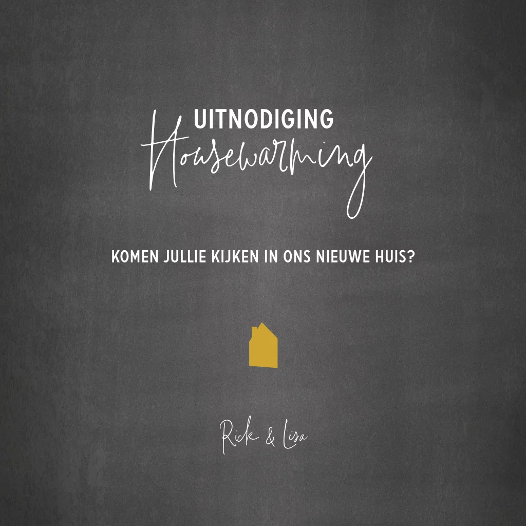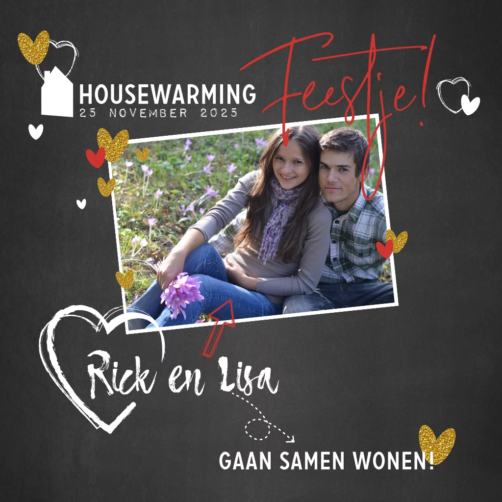 Hippe uitnodiging voor een housewarming. Je eigen foto op een stoere krijtbord-look achtergrond met witte en goudkleurige hartjes en huisje. Je kunt ook een foto van je huis plaatsen.