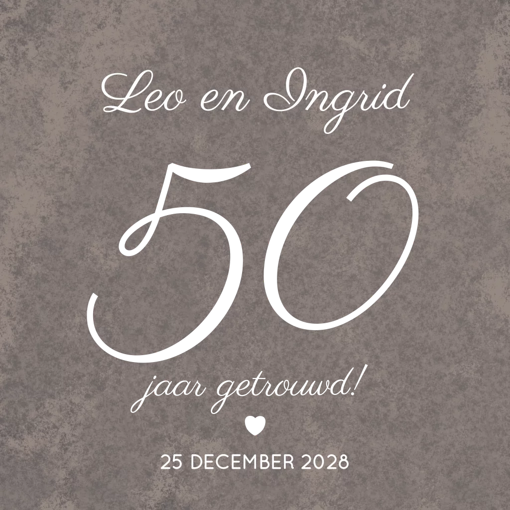 Vier een halve eeuw liefde en toewijding met onze prachtige jubileumuitnodiging. De achtergrond is uitgevoerd in rustgevende bruine en zandkleurige tinten met een verfijnde textuur, waardoor het een tijdloze elegantie uitstraalt.