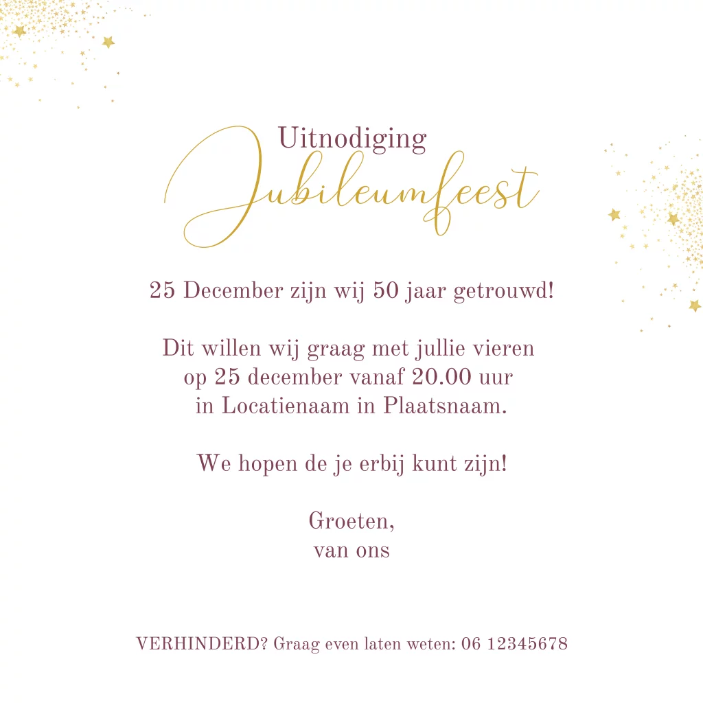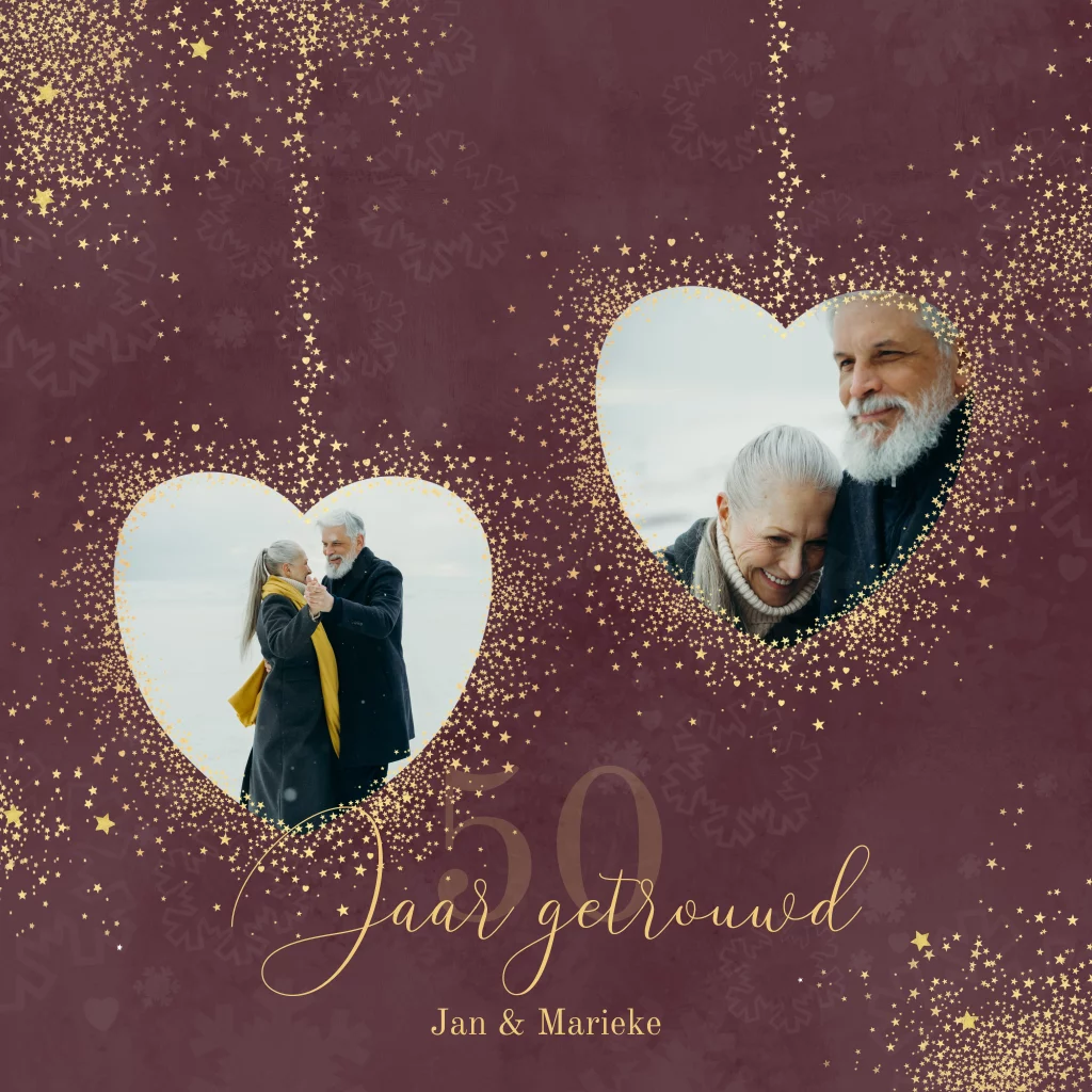 Wanneer je op zoek bent naar een stijlvolle kaart voor een bijzondere gelegenheid, dan is deze jubileumkaart zeker iets voor jou. De kaart heeft een sfeervolle uitstraling en is perfect voor een huwelijksjubileum. De plum-rode achtergrond maakt de kaart extra feestelijk en de twee hartjes fotokaders zorgen ervoor dat je eigen foto's mooi in de spotlight staan. De kaart wordt omringd door vele goudkleurige sterretjes, wat het geheel nog een stijlvoller uiterlijk geeft. Nodig familie en vrienden uit voor jullie jubileumfeest en maak er een onvergetelijke dag van. TIP: Bestel eerst een proefdruk van jullie jubileumkaart, zodat je zeker weet dat de kaart precies is zoals je wilt.