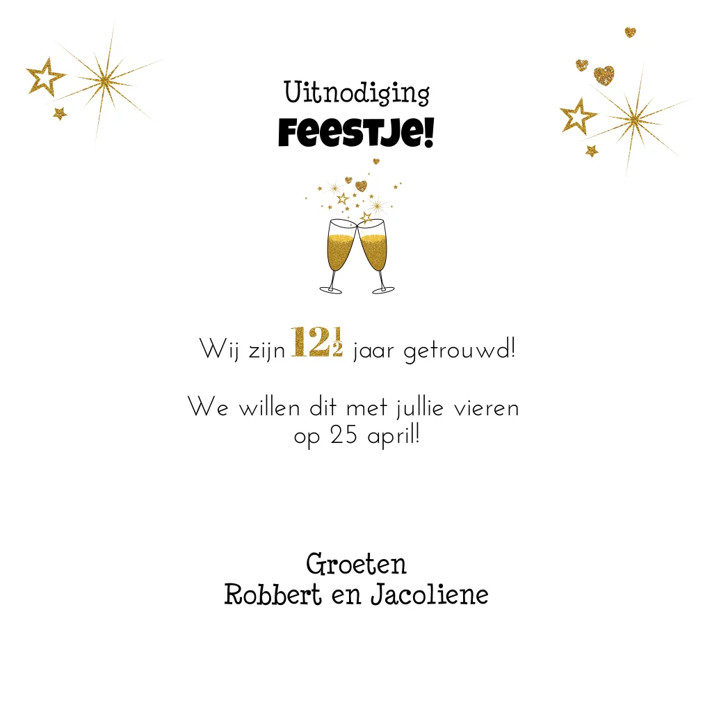 Uitnodiging voor een huwelijksjubileum feest, 12½ jaar getrouwd! Deze hippe kaart heeft een illustratie van twee proostende champagne glazen met goudkleurige sterren en hartjes. Het plaatje met de glitter 12½ kan gemakkelijk worden aangepast. In de editor vind je bij de afbeeldingen meerdere getallen die je kunt gebruiken. (geen goudfolie of echte glitters)
