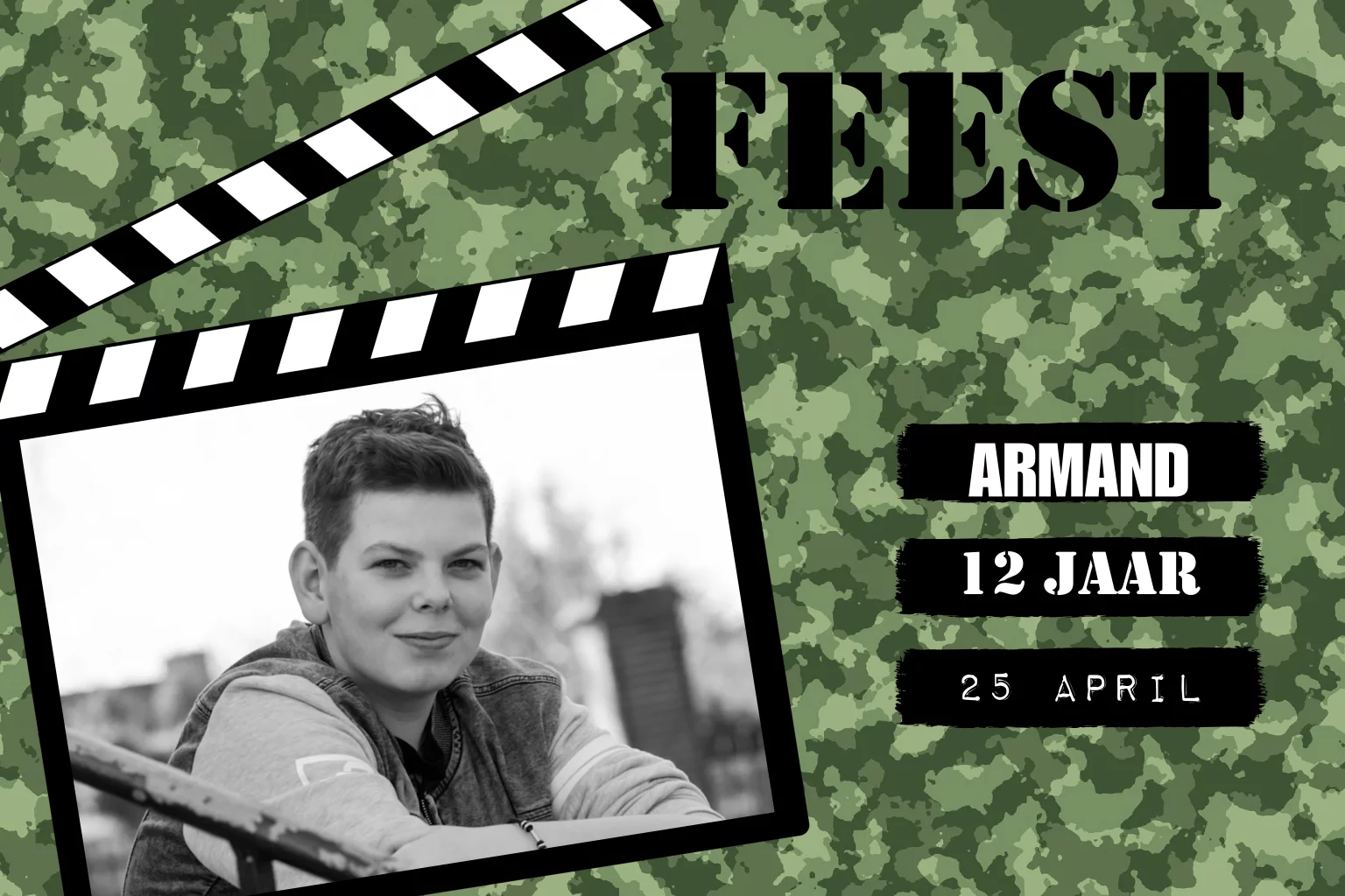Stoere kinderfeest uitnodiging met legerprint en foto