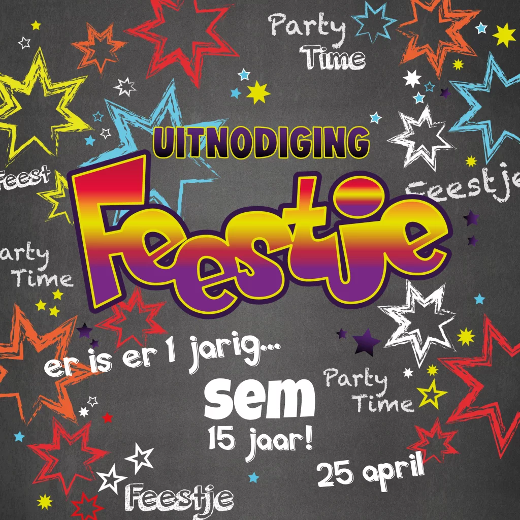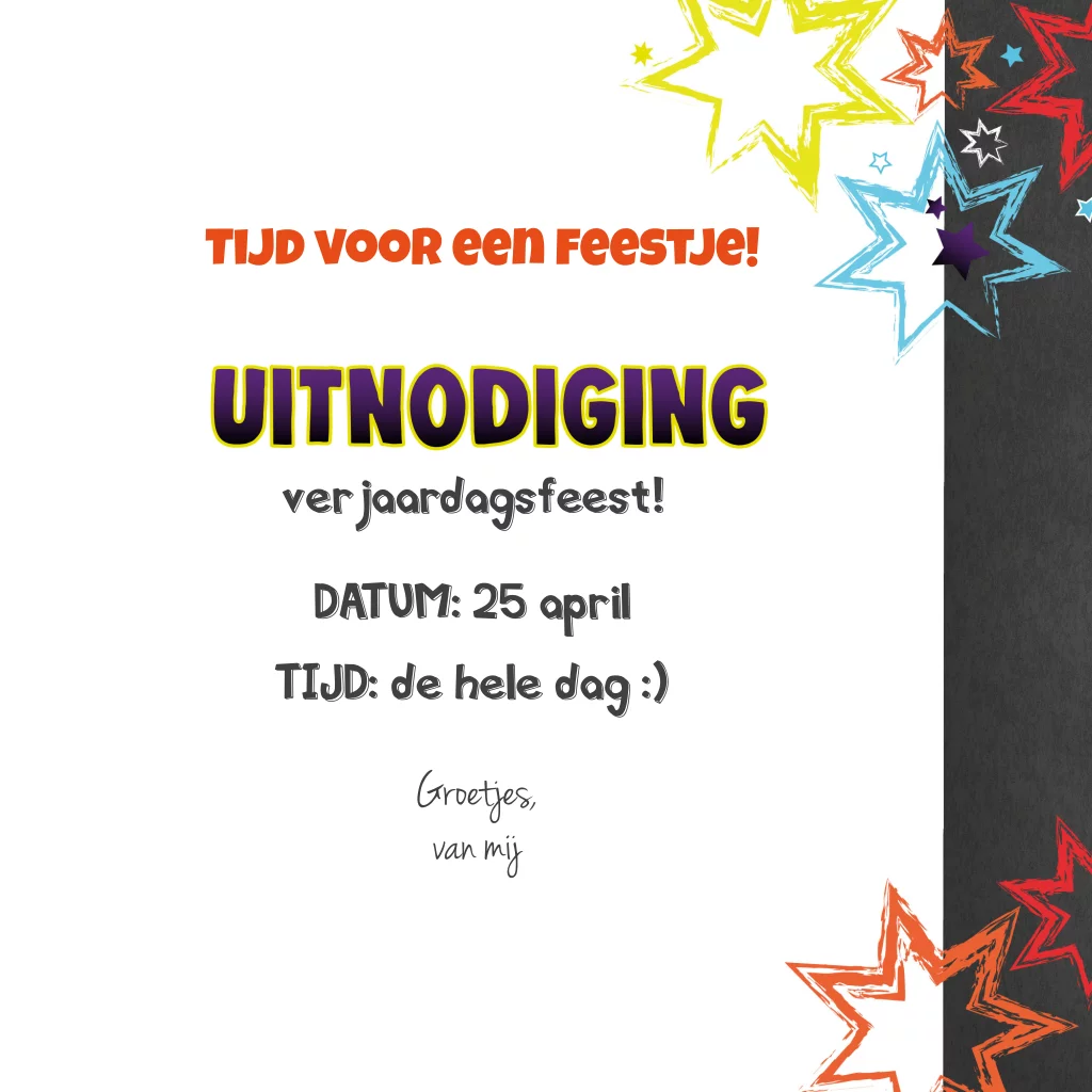 Stoere en vrolijke kinderfeest of verjaardagsuitnodiging voor jongens. Deze coole uitnodiging heeft een krijtbord look en gekleurde sterren en tekst in graffiti stijl.