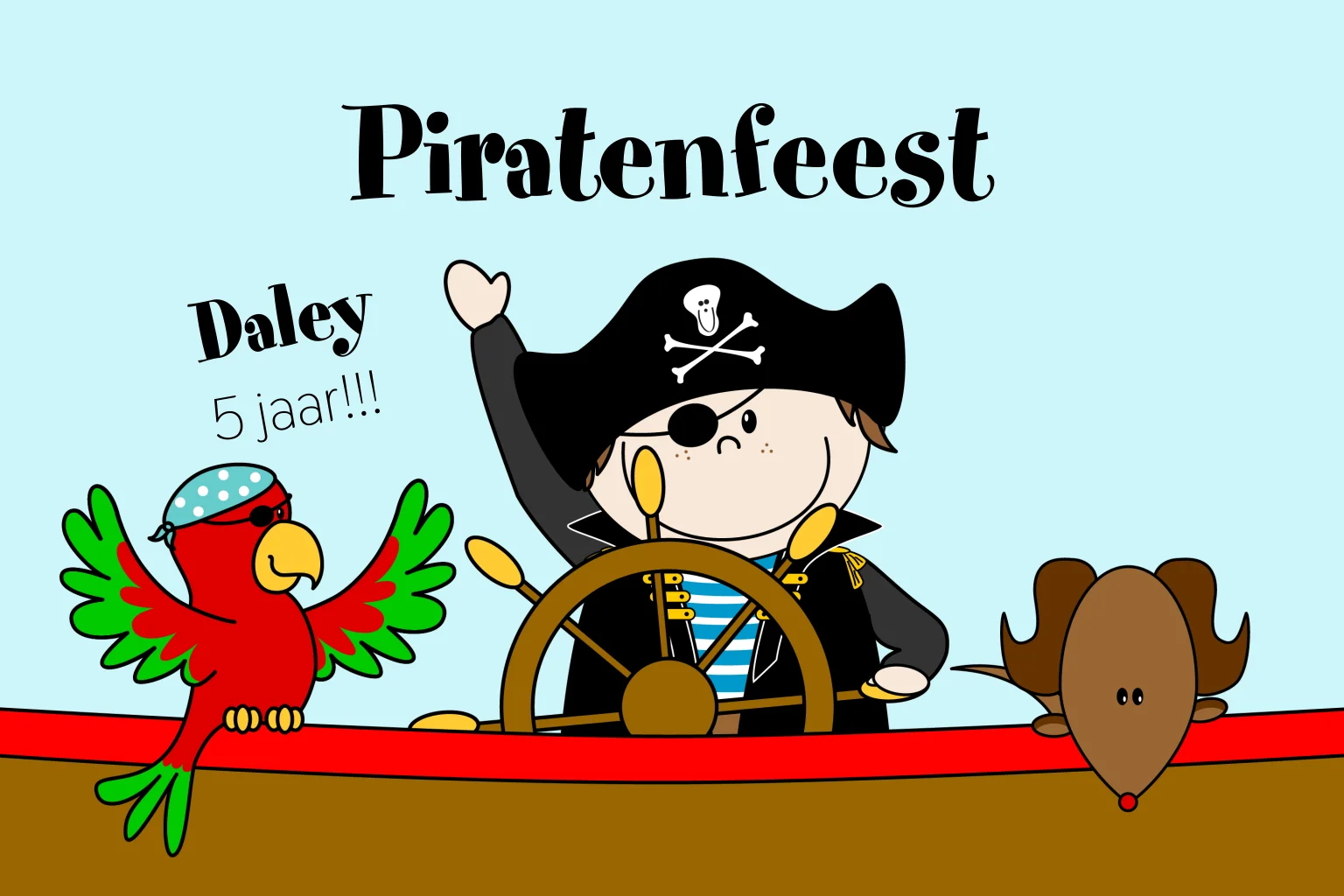 Uitnodiging kinderfeest piraat in boot met papegaai en hond
