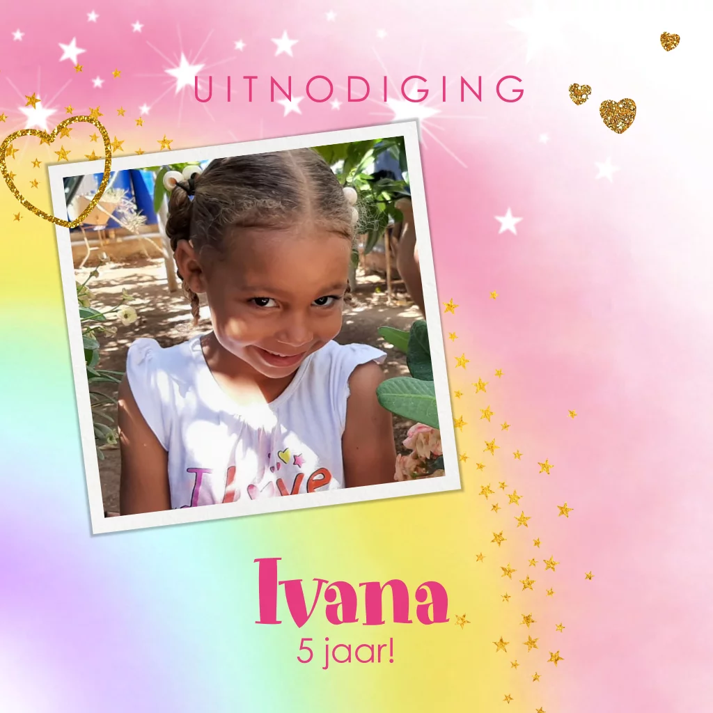 Uitnodiging meisje regenboog sterren hartjes en foto
