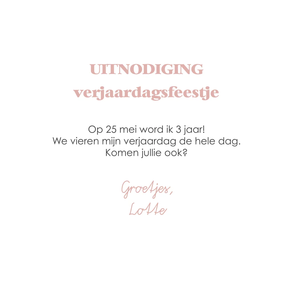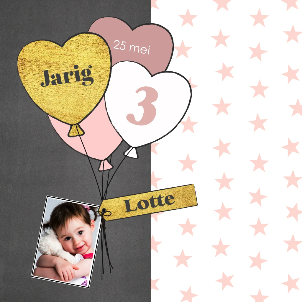 Leuke uitnodiging kinderverjaardag meisje met sterren, krijtbord-look en een illustratie van ballonnen met een foto van de jarige. Vervang de foto en pas de teksten naar wens aan en nodig familie en vrienden uit voor de verjaardag van jouw dochtertje.