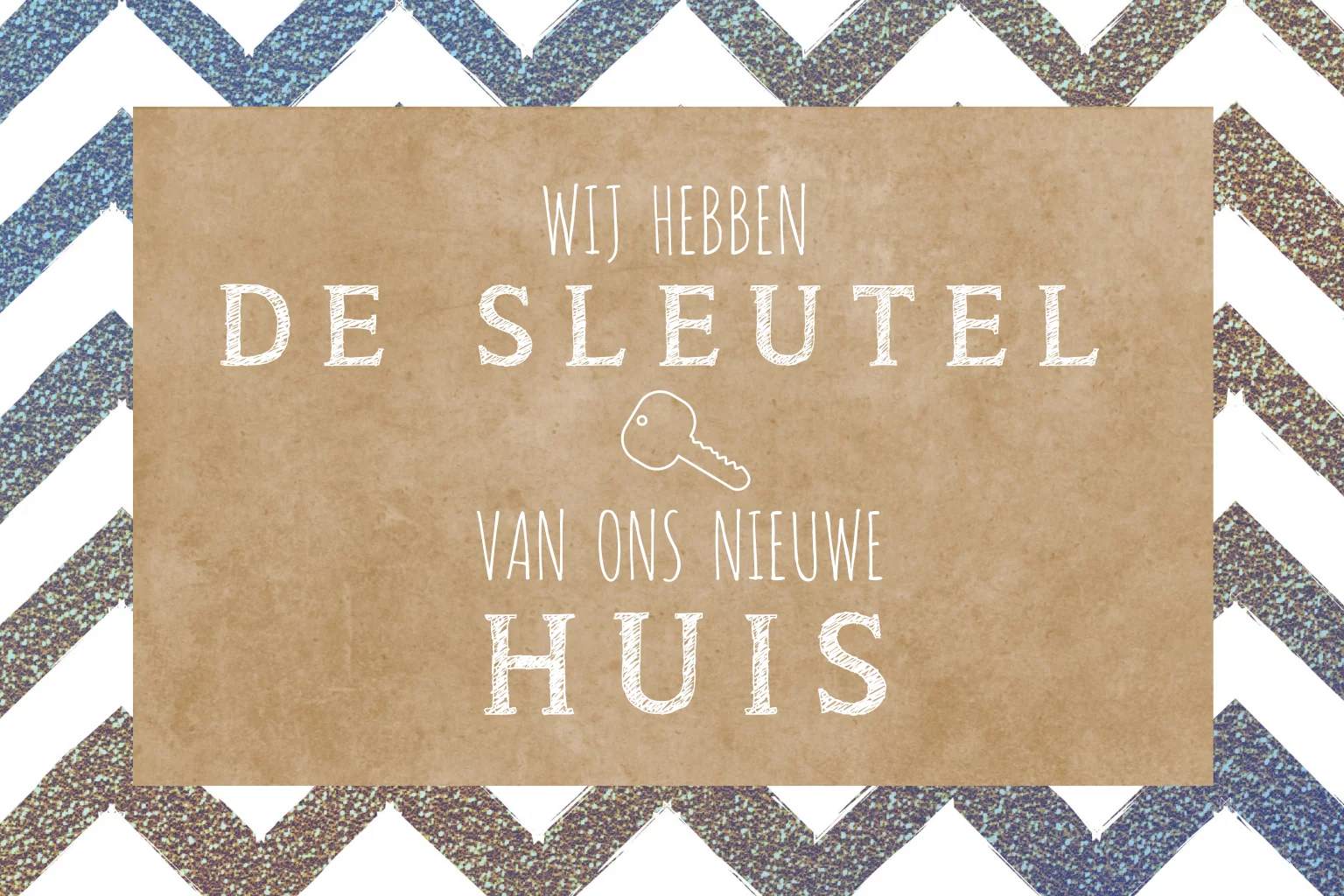 Verhuiskaart - adreswijziging. "Wij hebben de sleutel van ons nieuwe huis". Hippe kaart met glitter zigzag achtergrond en kraft look.