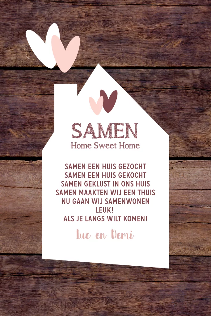 Verhuiskaart - Samenwonen. Stoer en lief kaartje met een hout-print op de achtergrond een huisje met hartjes en een gedichtje. De teksten zijn naar wens aan te passen.