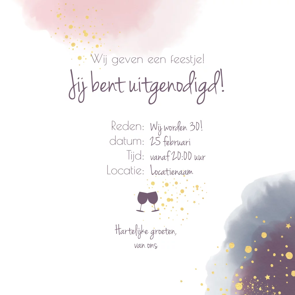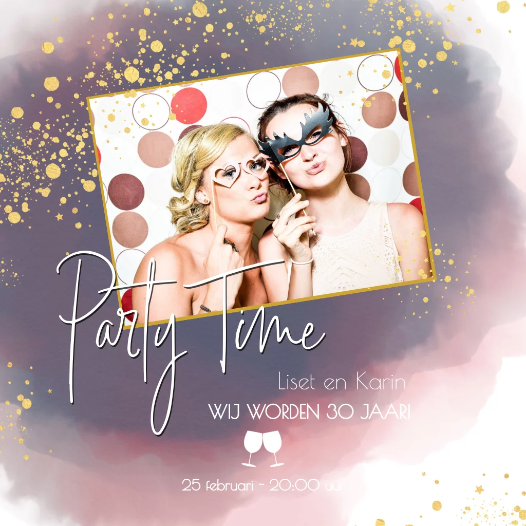Hippe en feestelijke uitnodiging met je eigen foto op een achtergond met waterverf look en goudkleurige stippen en sterren. (geen goudfolie)