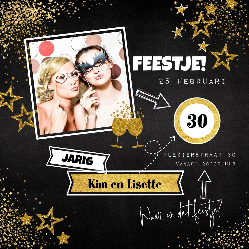 Hippe en stoere uitnodiging voor een feestje. Deze zwarte feestelijke kaart met vele elementjes kan naar wens worden aangepast en voor diverse gelegenheden worden gebruikt.