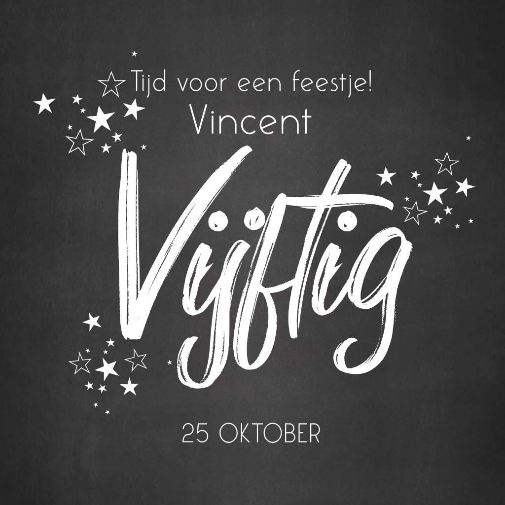 Maak een statement met deze stijlvolle en stoere verjaardagsuitnodiging voor het vieren van 50 prachtige jaren! De donkergrijze achtergrond met subtiele textuur straalt klasse uit, terwijl de tekst en sterren met gouden folie zijn gedrukt, wat zorgt voor een schitterend contrast en een vleugje luxe.