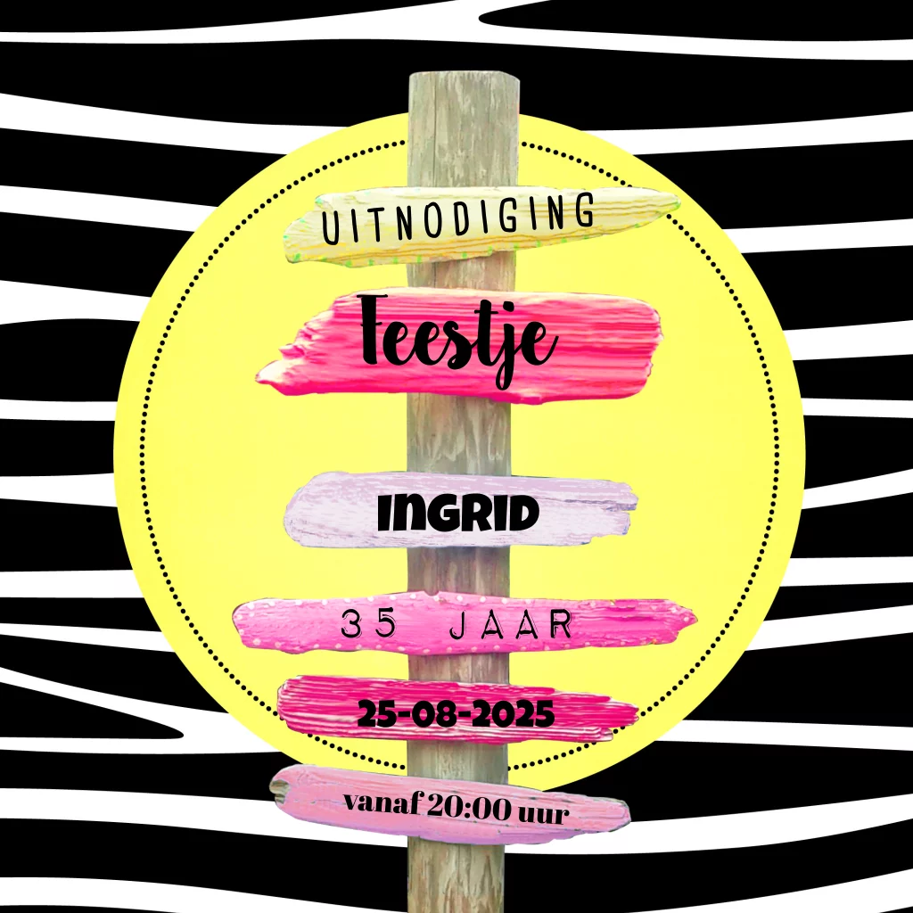 Originele en trendy uitnodiging met zebraprint en wegwijzer. De teksten op deze uitnodigingskaart zijn gemakkelijk aan te passen. Je maakt er snel en gemakkelijk jouw eigen originele uitnodiging van. Leuke uitnodiging voor een verjaardag of ander feestje.
