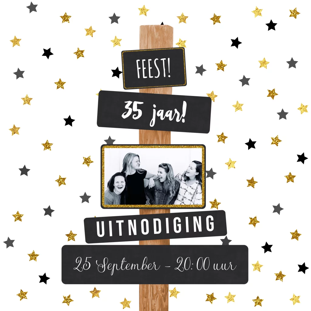 Trendy en feestelijke uitnodiging met goudkleurige sterren en een wegwijzer met krijtborden waarop een eigen foto en tekst geplaatst kan worden.