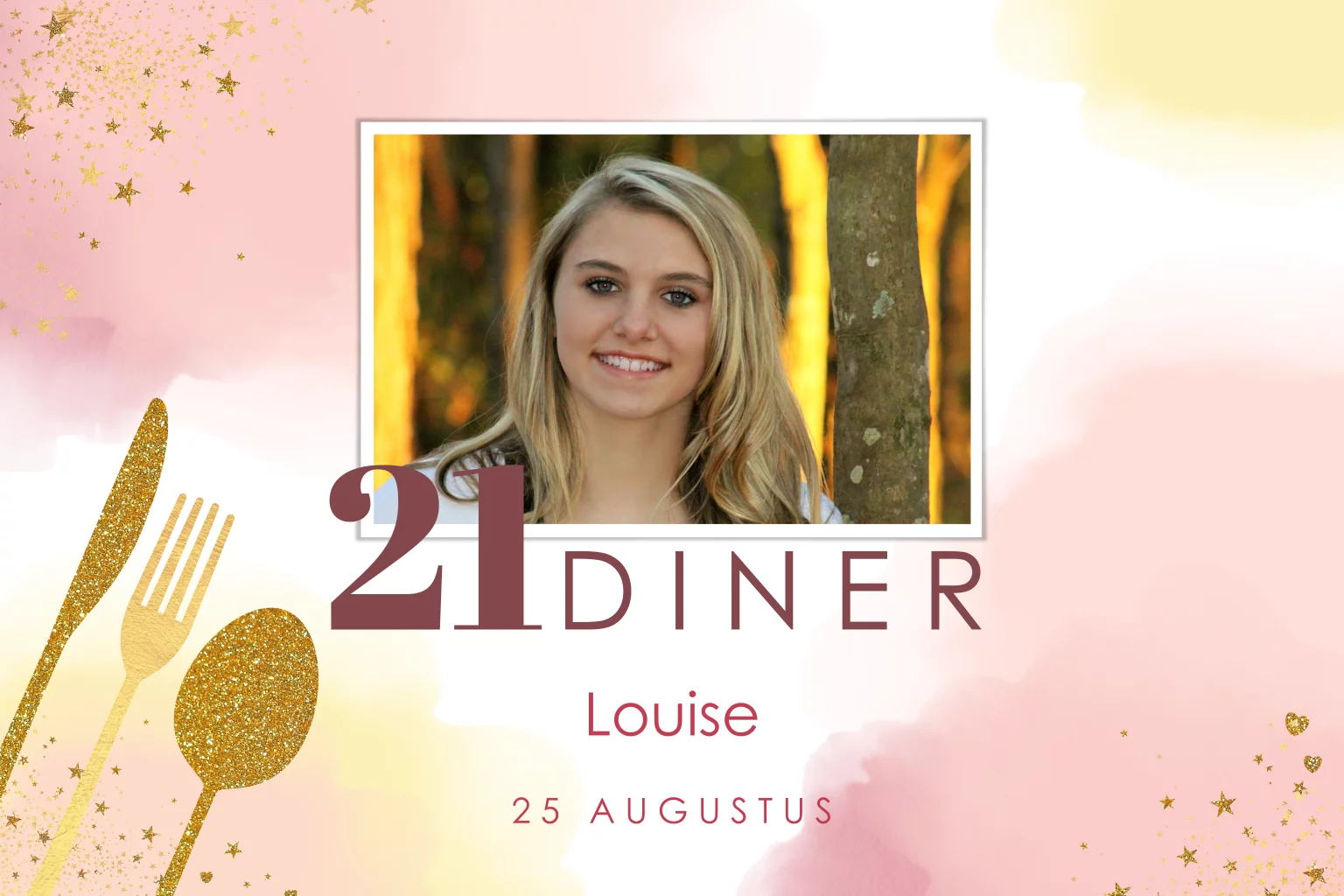 Hippe en trendy uitnodiging voor een 21 diner met een eigen foto. Pastel waterverf, goudkleurig bestek en sterren. (geen echte glitters of goudfolie) Vervang de foto en pas de uitnodiging naar wens aan. Maak je feest compleet met de passende menukaart van dezelfde huisstijl. HUISSTIJL: zomerse pasteltinten watercolor.