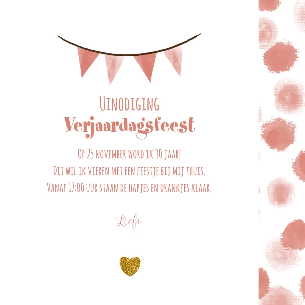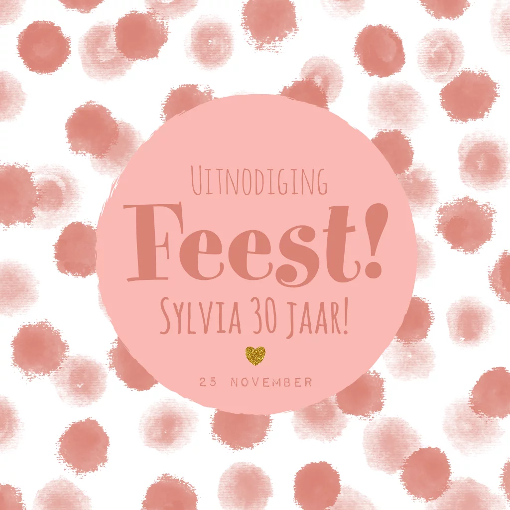 Feestelijke, hippe uitnodiging voor een feestje met zalm roze stippen. De tekst kun je helemaal naar wens aanpassen.