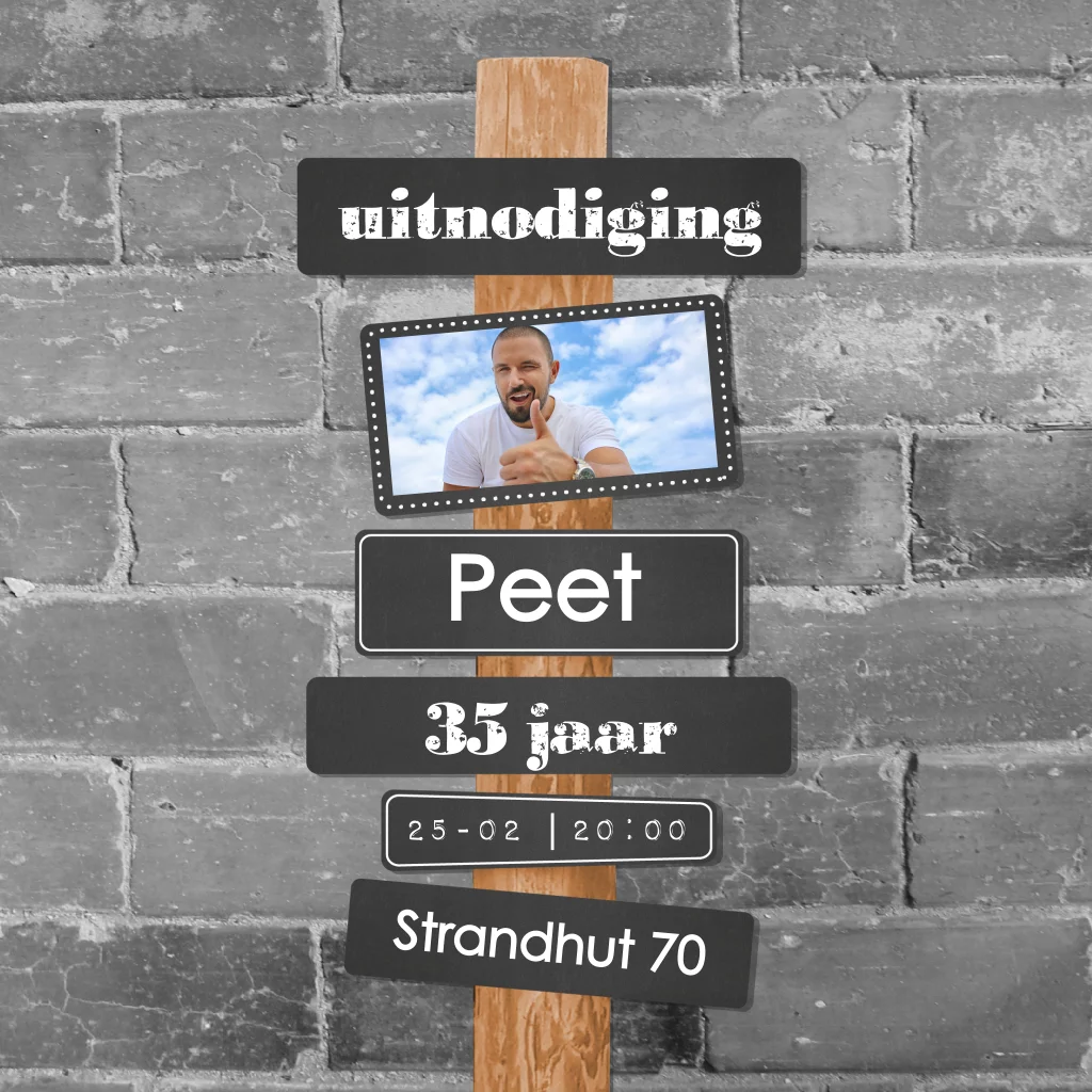 Stoere foto uitnodiging verjaardag muur met een wegwijzer