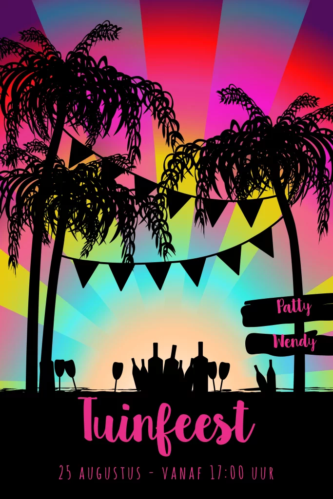 De kaart heeft een gekleurde illustratieve vormgeving van een zonsondergang bij het strand met zwarte palmbomen, slinger en drankjes.