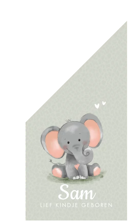 Hang de vlag maar uit en laat iedereen in jullie omgeving weten dat jullie kindje is geboren met deze groene geboortevlag met daarop een lief olifantje en de naam van jullie kindje.