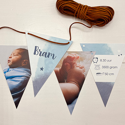 Het bevestigingsmateriaal bestel je los bij de kaart. Je kunt zelf kiezen uit één van onze mooie touwtjes of velvet linten. Tijdens het bestellen van jouw geboortekaartje kun je aanvinken welke van deze producten je bij jouw kaartje wenst. Je dient de vlaggenlijn zelf in elkaar te zetten.