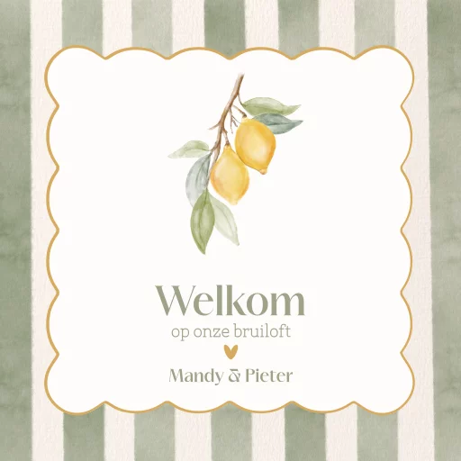 Geef jullie bruiloft een frisse en zomerse start met dit romantische welkomstbord met citroentak. De handgeschilderde illustratie, zachte groene strepen en speels geschulpte rand zorgen voor een warme, elegante uitstraling die perfect past bij een buitenbruiloft of mediterrane sfeer.