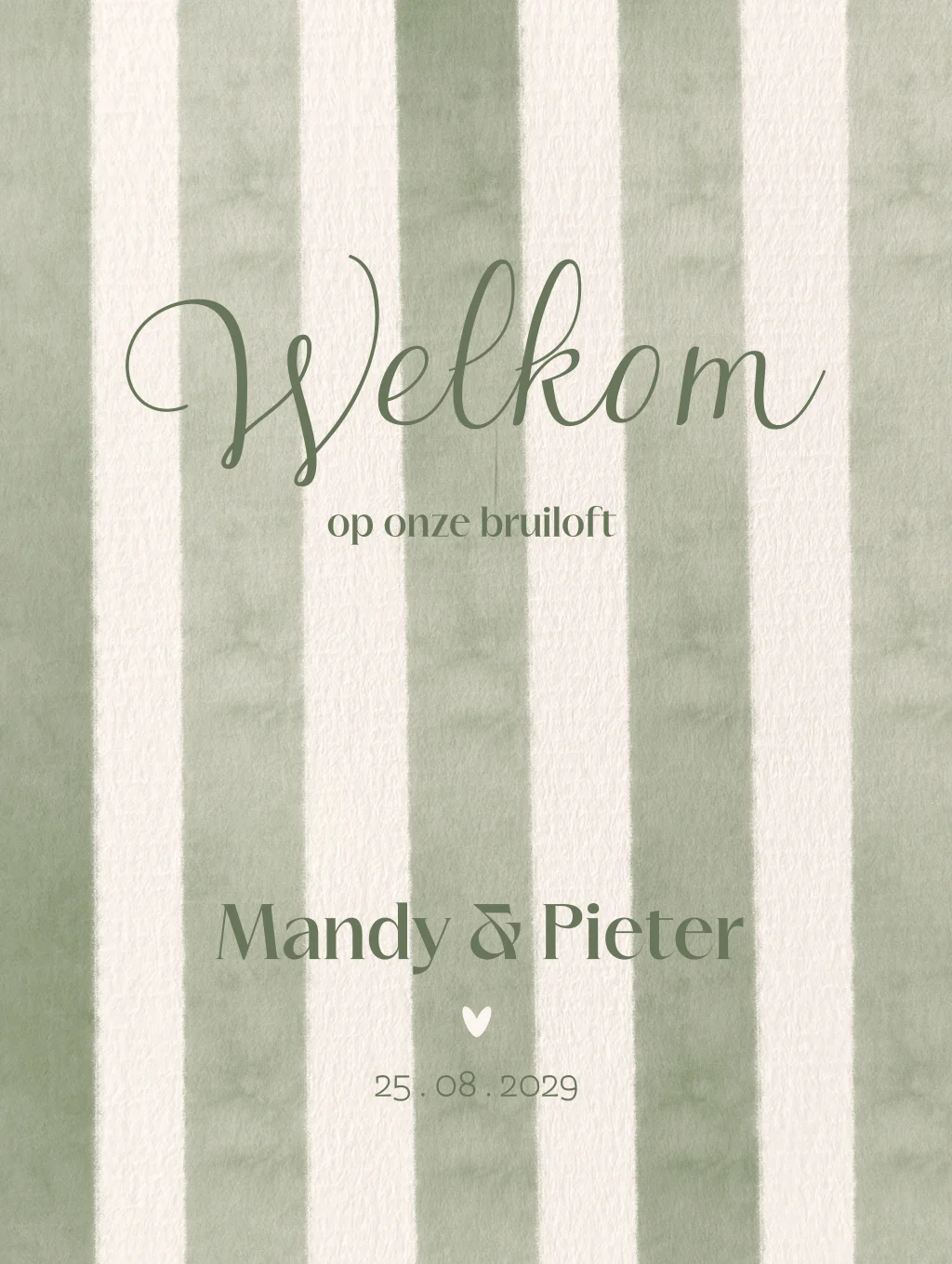 Een stijlvol welkomstbord bruiloft met zachte olijfgroene waterverfstrepen in de herkenbare sfeer van de Amalfi Romance trouwhuisstijl. De rustige strepen en elegante typografie zorgen voor een tijdloze en luxe uitstraling.