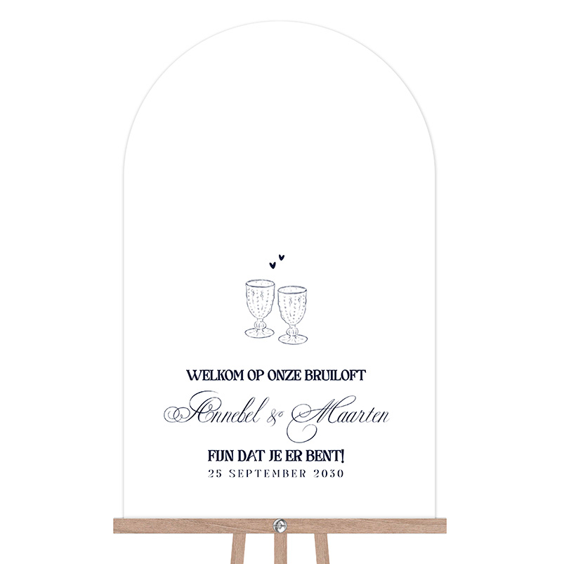 Een warm welkom voor jullie gasten met dit stijlvolle welkomstbord uit de Soft Vintage Toast collectie. De witte achtergrond, donkerblauwe typografie en handgetekende glazen geven het bord een elegante, romantische uitstraling.
