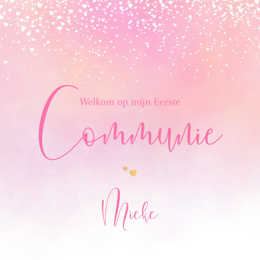 Geef het communiefeest een liefdevolle start met dit dromerige welkomstbord. De zachte lichtroze tinten, schattige witte hartjes en een vleugje geel zorgen voor een warme en feestelijke uitstraling. Het bord heet jullie gasten op een speelse en elegante manier welkom en past perfect bij een communie vol mooie herinneringen.