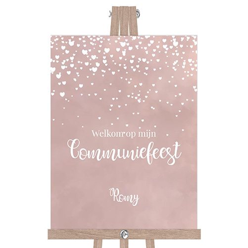 Maak je communiefeest extra bijzonder met dit stijlvolle welkomstbord in de stijl van de originele uitnodiging. Het bord heeft een elegante grijs-roze velvet look met veel witte hartjes, afgewerkt met sierlijke letters. Een prachtig, persoonlijk detail dat perfect past bij je feestthema. Het ontwerp is volledig naar wens aan te passen, zodat het naadloos aansluit bij de rest van je communie-uitnodigingen en decoratie.