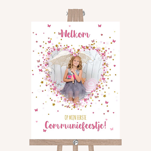Welkomstbord Communie met foto hartjes bloemen en vlinders