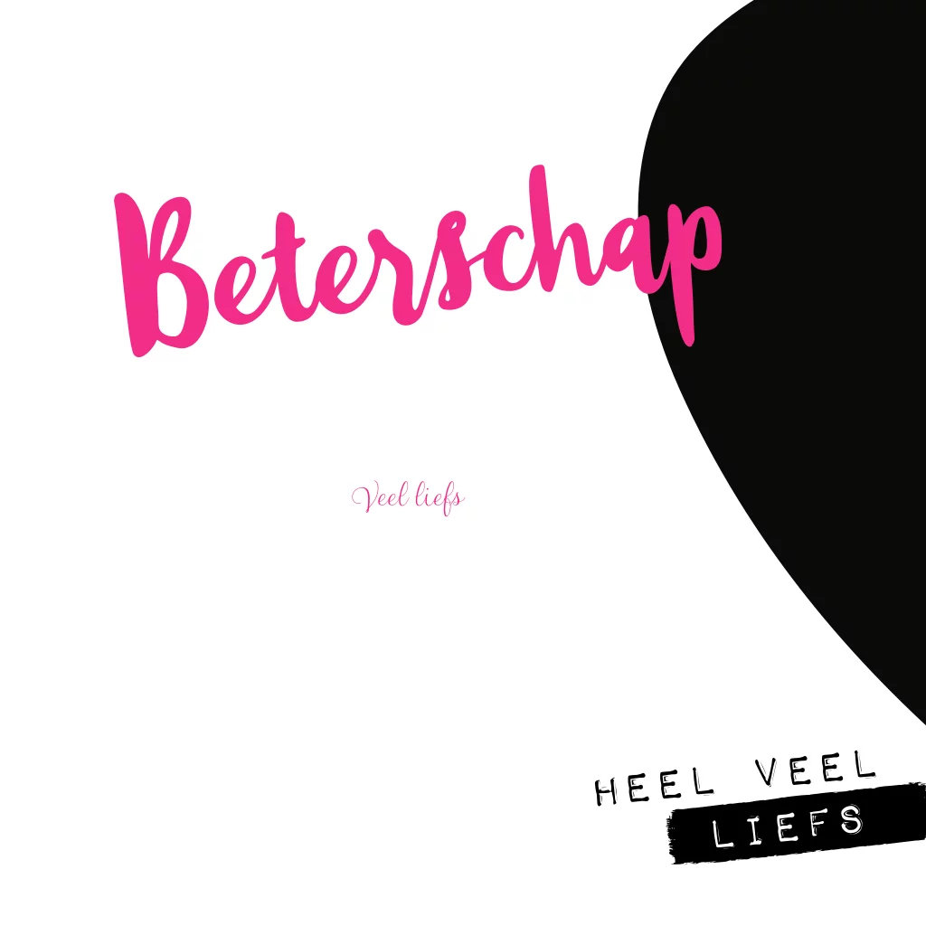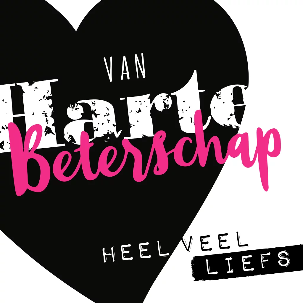 Stoere beterschap kaart. Zwart, wit en roze met een groot zwart hart. Van harte beterschap.