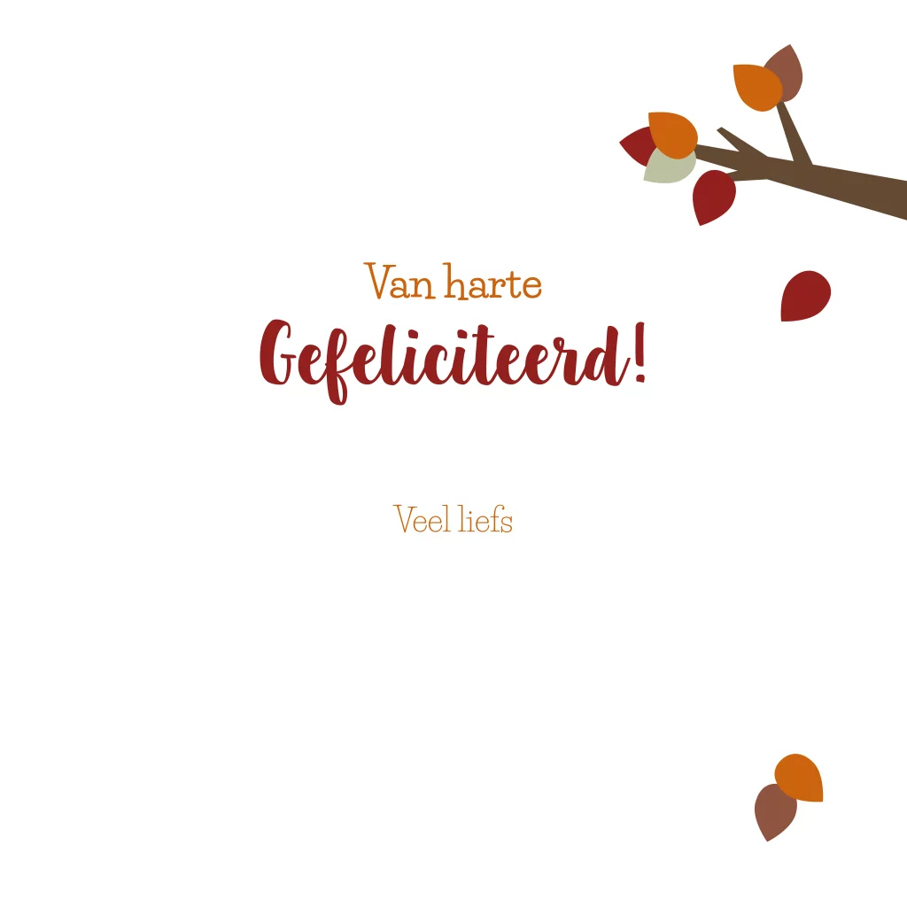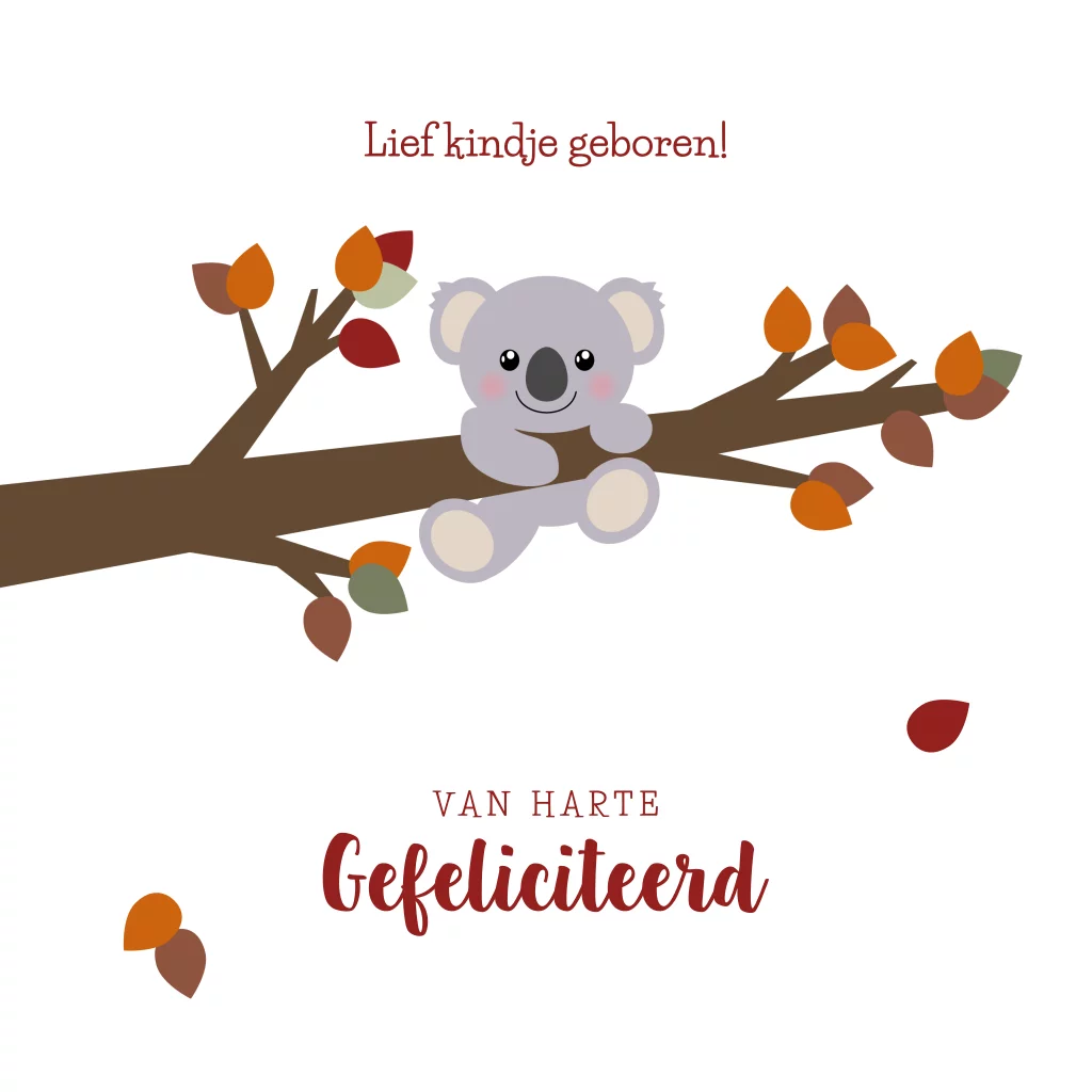 Wenskaart. Schattig felicitatie kaartje voor de geboorte van een jongen of een meisje. Dit schattige kaartje heeft een illustratie van een lief koalabeertje, hangend aan een tak met blaadjes in herfstkleuren.