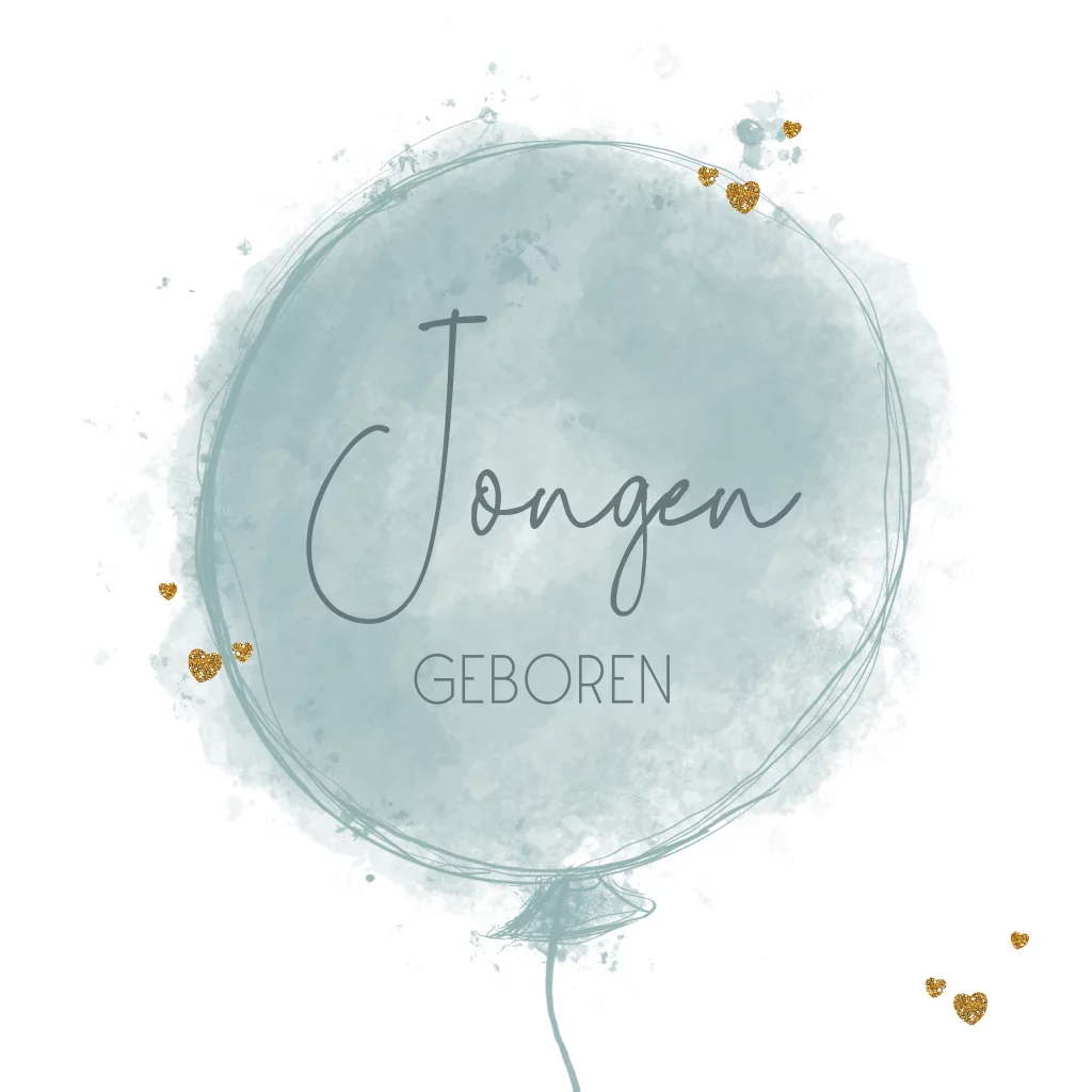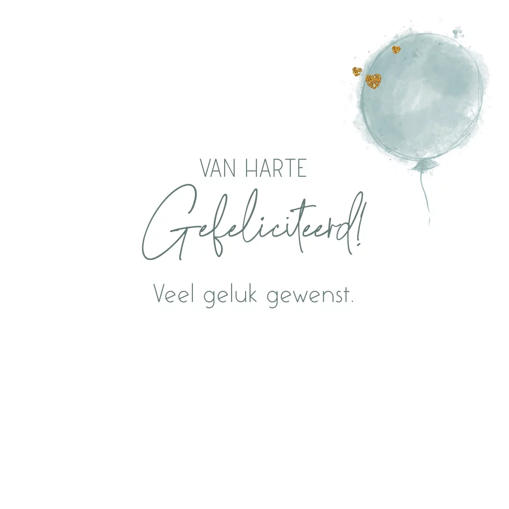 Felicitatie kaart voor de geboorte van een jongen. Abstract vormgegeven ballon en goudkleurige hartjes.