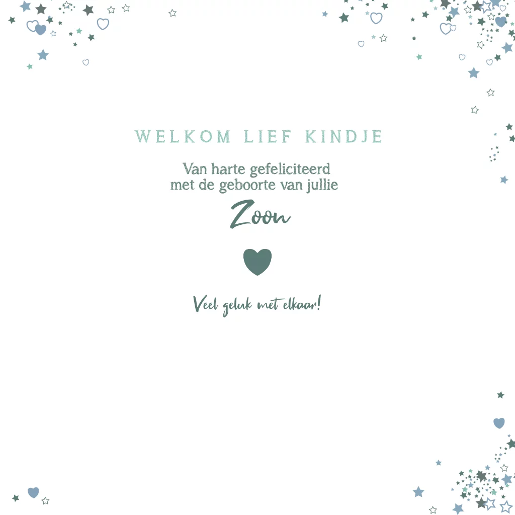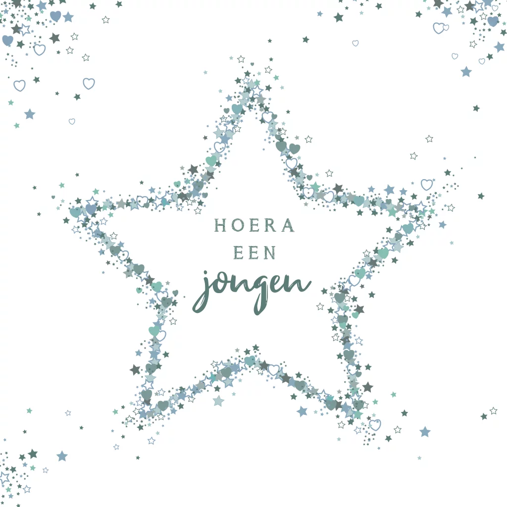Felicitatie geboorte jongen. Lief kaartje met een ster van sterren en hartjes. TIP: Maak de kaart extra persoonlijk door de naam van het kindje op de kaart te plaatsen.