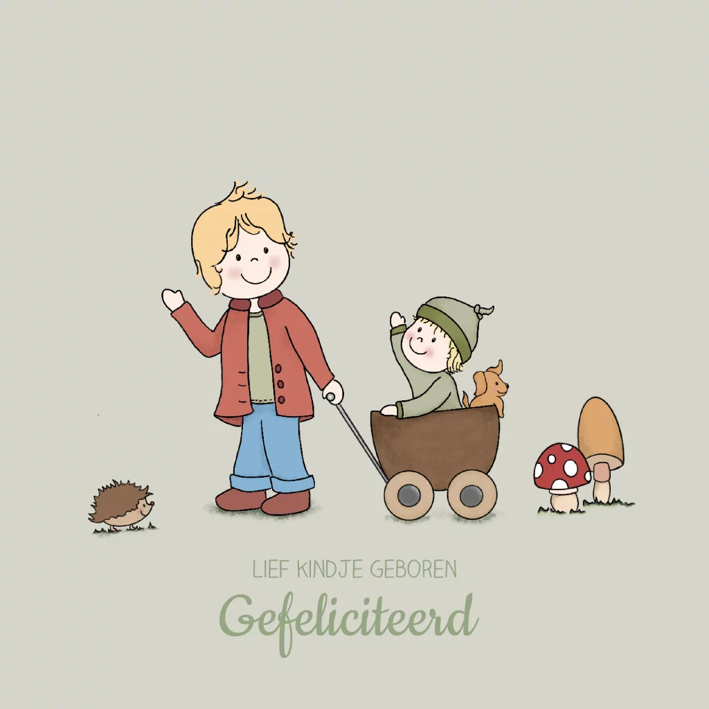 Verwelkom de geboorte van een lief jongetje met onze herfstachtige felicitatie kaart. De kaart straalt tederheid uit met een afbeelding van een jongen die zijn baby broertje in een bolderkar voorttrekt, met paddenstoelen en een lief egeltje. Je kunt deze kaart naar eigen wens aanpassen en met één klik direct naar de blije ouders laten verzenden. Een persoonlijke en vertederende manier om je felicitaties over te brengen tijdens dit bijzondere moment!