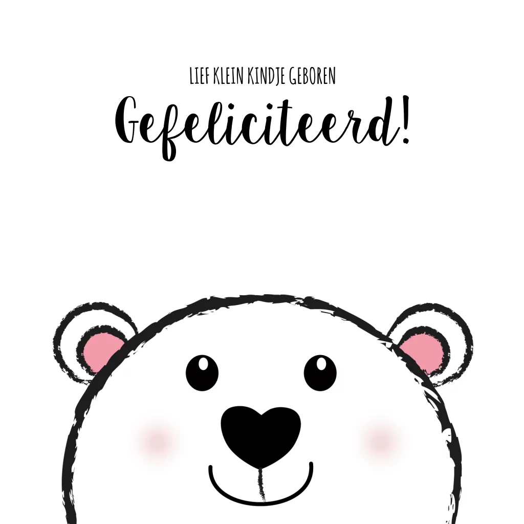 Stoere en lieve felicitatie kaart voor de geboorte van een jongen of een meisje. Zwart-wit kaartje met een illustratie van een schattige ijsbeer met roze wangen.