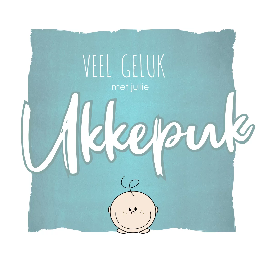 Stoere felicitatie-kaart voor de geboorte van een jongen. Grappige kaart met de tekst; "Veel geluk met jullie ukkepuk" en een illustratie van een blij baby'tje.