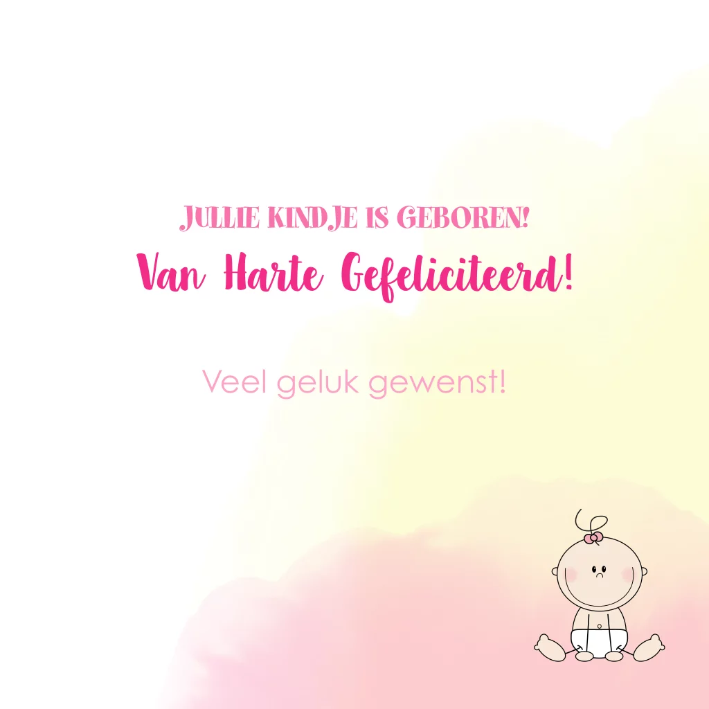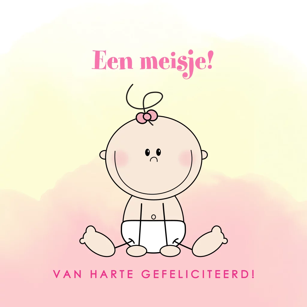 Felicitatie kaart voor de geboorte van een meisje. Zomerse tinten waterverf en een tekening van een schattige baby.