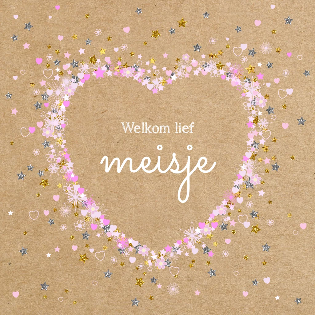Hippe felicitatie-kaart voor de geboorte van een meisje. Lief kaartje met een hart van hartjes, sterren en bloemen op een kraft-look achtergrond. TIP: Maak je kaartje extra persoonlijk door de naam van het kindje op de kaart te plaatsen.