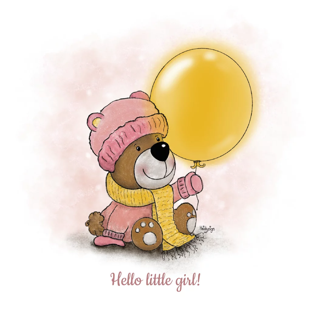 Deze Schattige felicitatie kaart heeft een tekening van een lief beertje met een grote magische ballon. Het beertje draagt een warme jas, sjaal, muts en handschoenen. Extra leuk voor als het kindje in de winter is geboren.