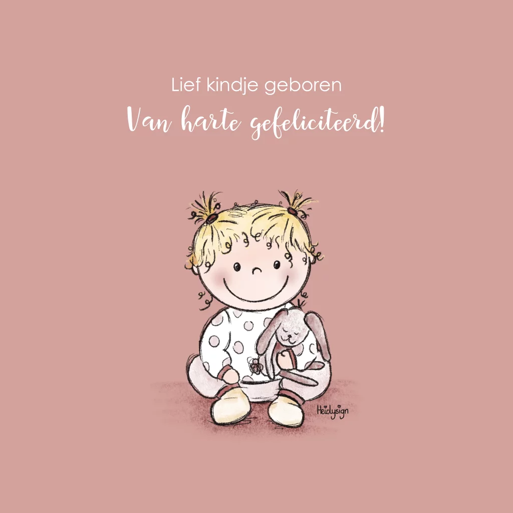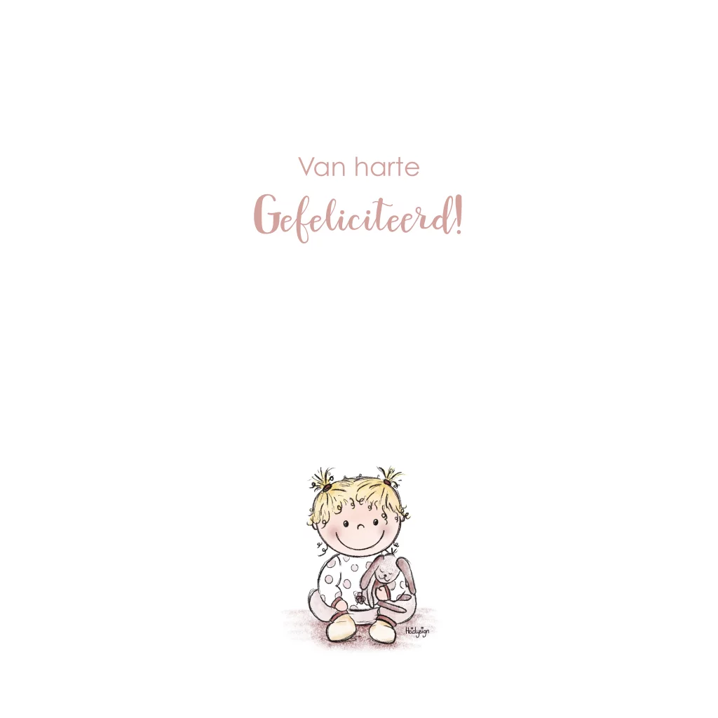 Schattig, roze felicitatie kaartje voor de geboorte van een meisje. Deze kaart heeft een tekening van een schattig kindje met zijn knuffel konijntje. Je kunt deze kaart naar wens aanpassen en direct naar de kersverse ouders laten versturen. Deze kaart is ook erg leuk om een opa en oma te feliciteren met de geboorte van hun kleinkind.