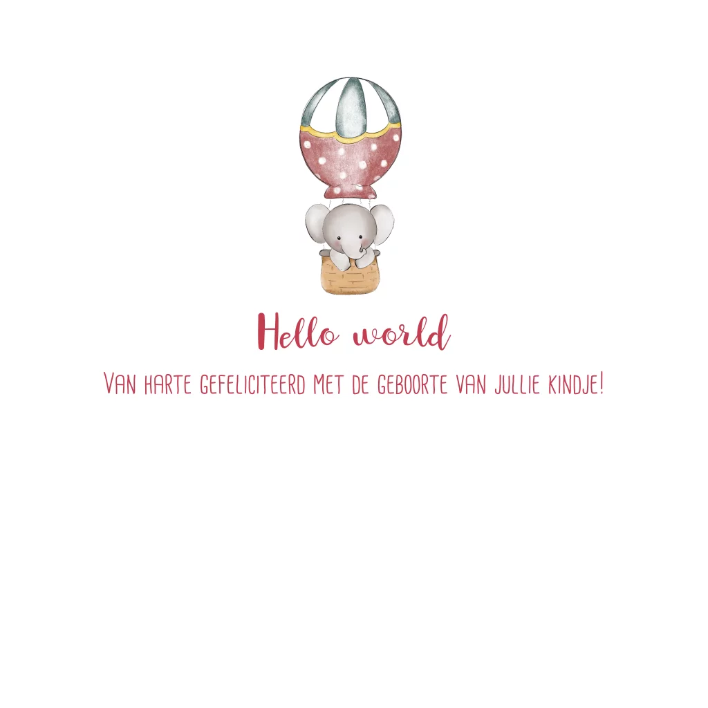 Felicitatie voor de geboorte van een jongen of meisje. Lief babykaartje met een tekening van een luchtballon met daarin een olifantje. Hello world! Pas deze hippe felicitatie kaart naar wens aan en verras de kersverse ouders met deze schattige wenskaart in de brievenbus. Tip: Vervang het woord "world" voor de naam van de baby.