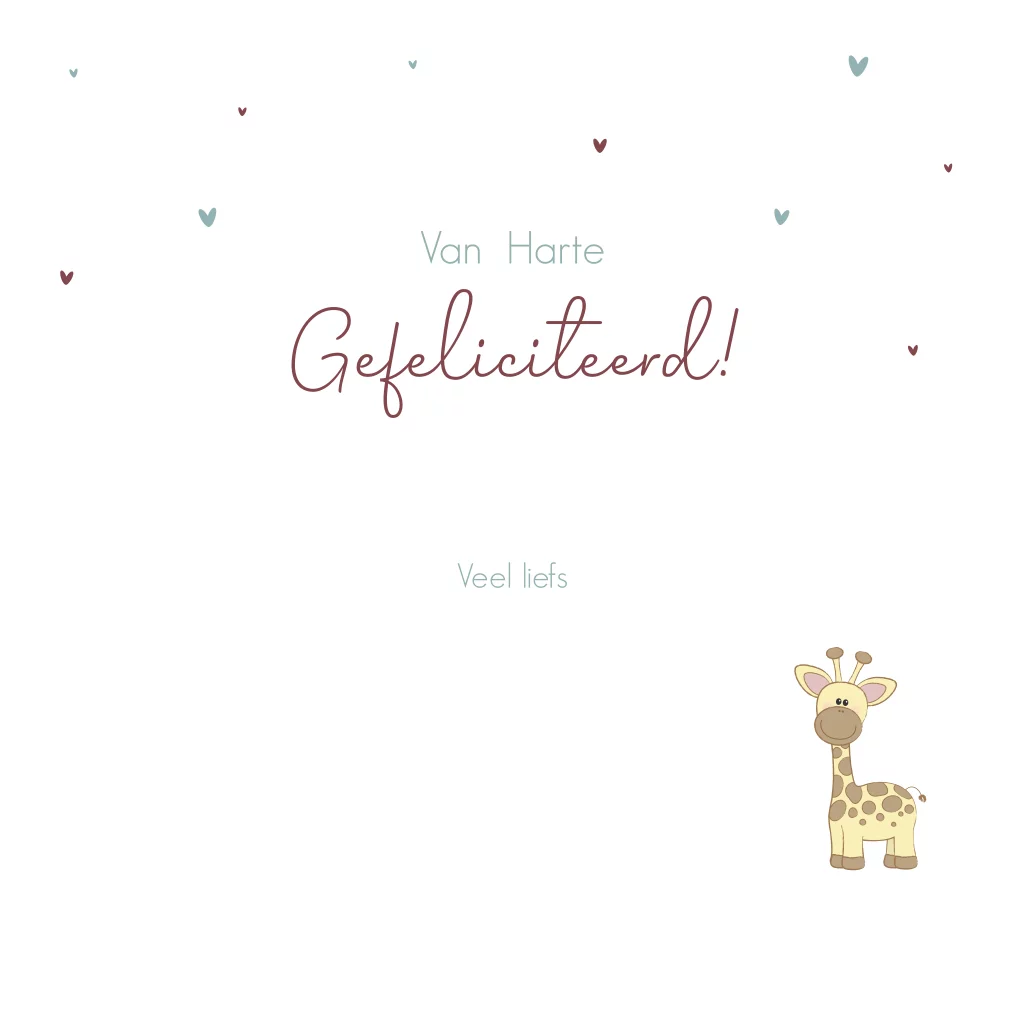 Felicitatie voor de geboorte van een tweeling. Dit lieve felicitatie kaartje met 2 schattige giraffes en vele hartjes kan voor jongens en meisje worden gebruikt.