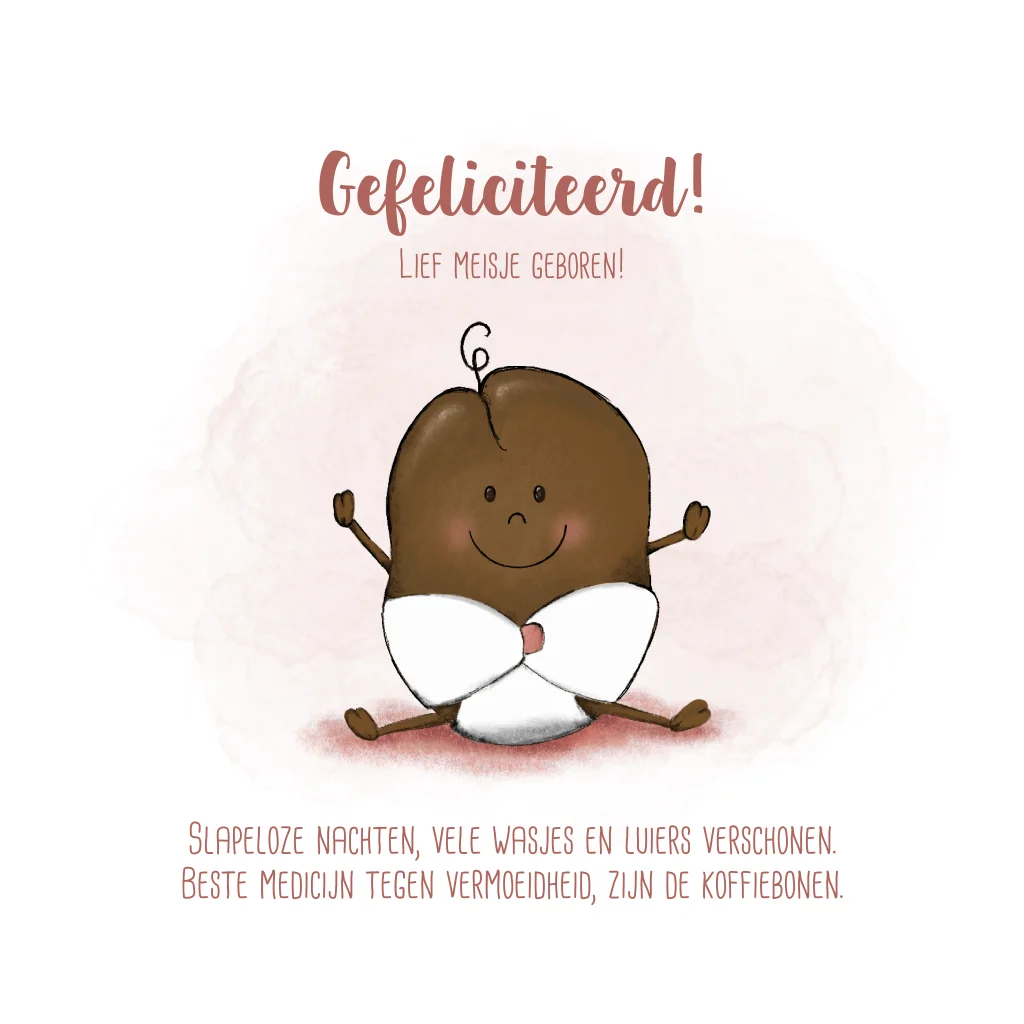 Grappige felicitatie kaart geboorte meisje met een koffieboon