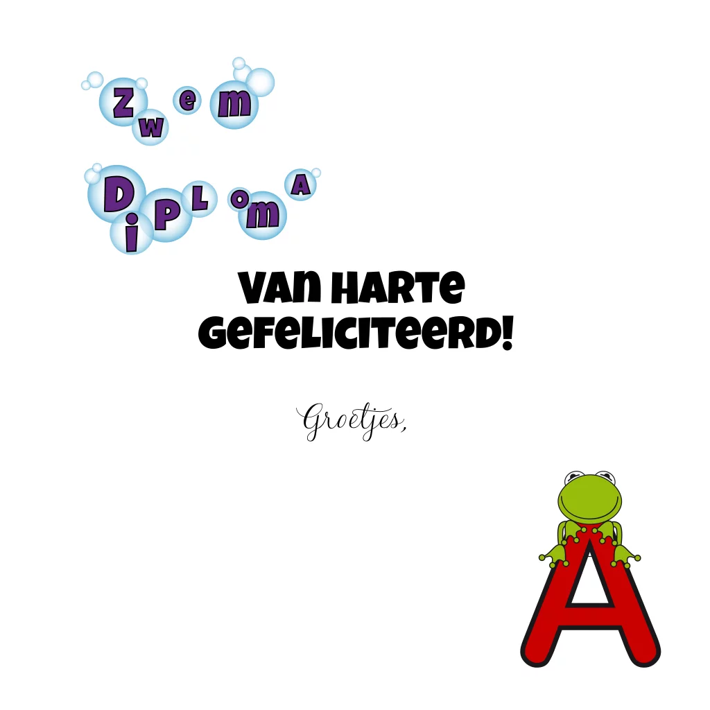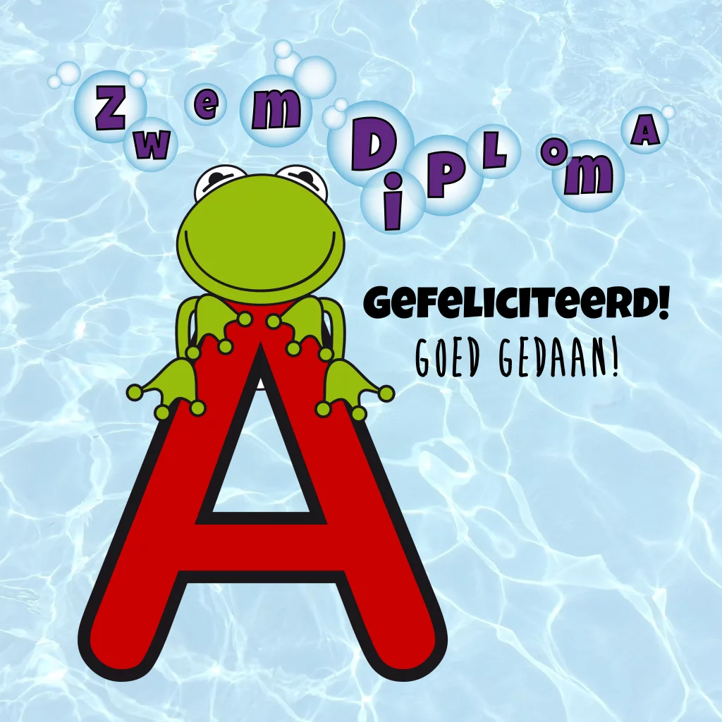 Leuke felicitatie voor een zwemdiploma A. Deze wenskaart heeft een illustratie van een grote letter A met een lief kikkertje.