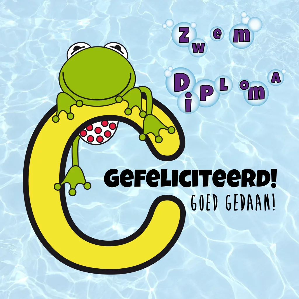 Diploma! Leuke felicitatie voor een zwemdiploma C. Deze wenskaart heeft een illustratie van een grote letter C met een lief kikkertje.