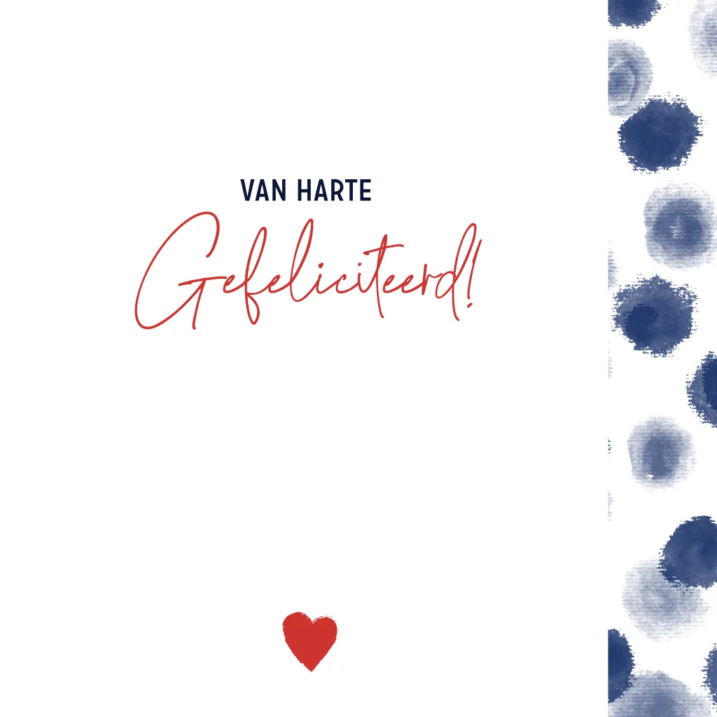 Geslaagd! Diploma! Hippe felicitatie met blauwe stippen en een groot rood hart. TIP: Plaats de naam van de ontvanger op het grote hart en maak jouw kaart zo extra persoonlijk