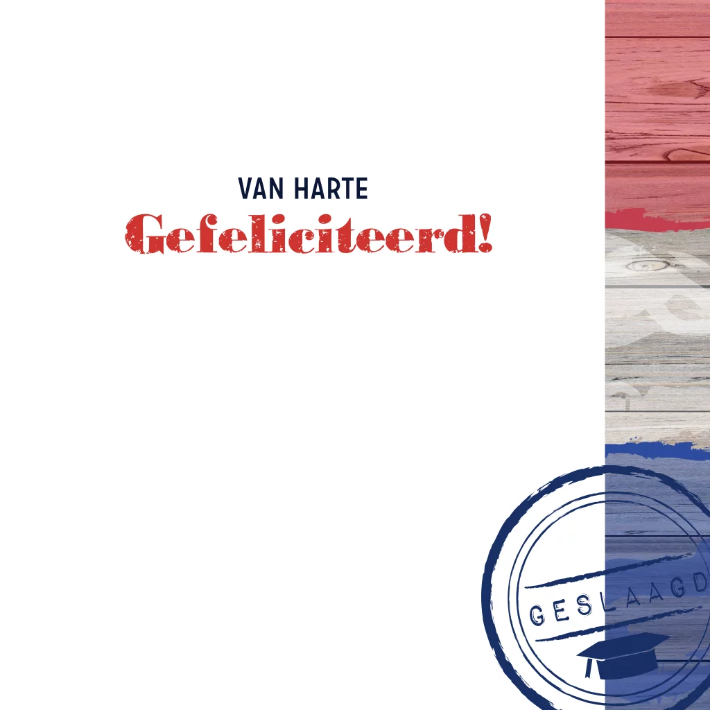 Geslaagd! Diploma! Stoere felicitatie kaart. Rood, wit blauw met een stempel. BELANGRIJK: vergeet niet de naam op de voorkant van de kaart aan te passen.