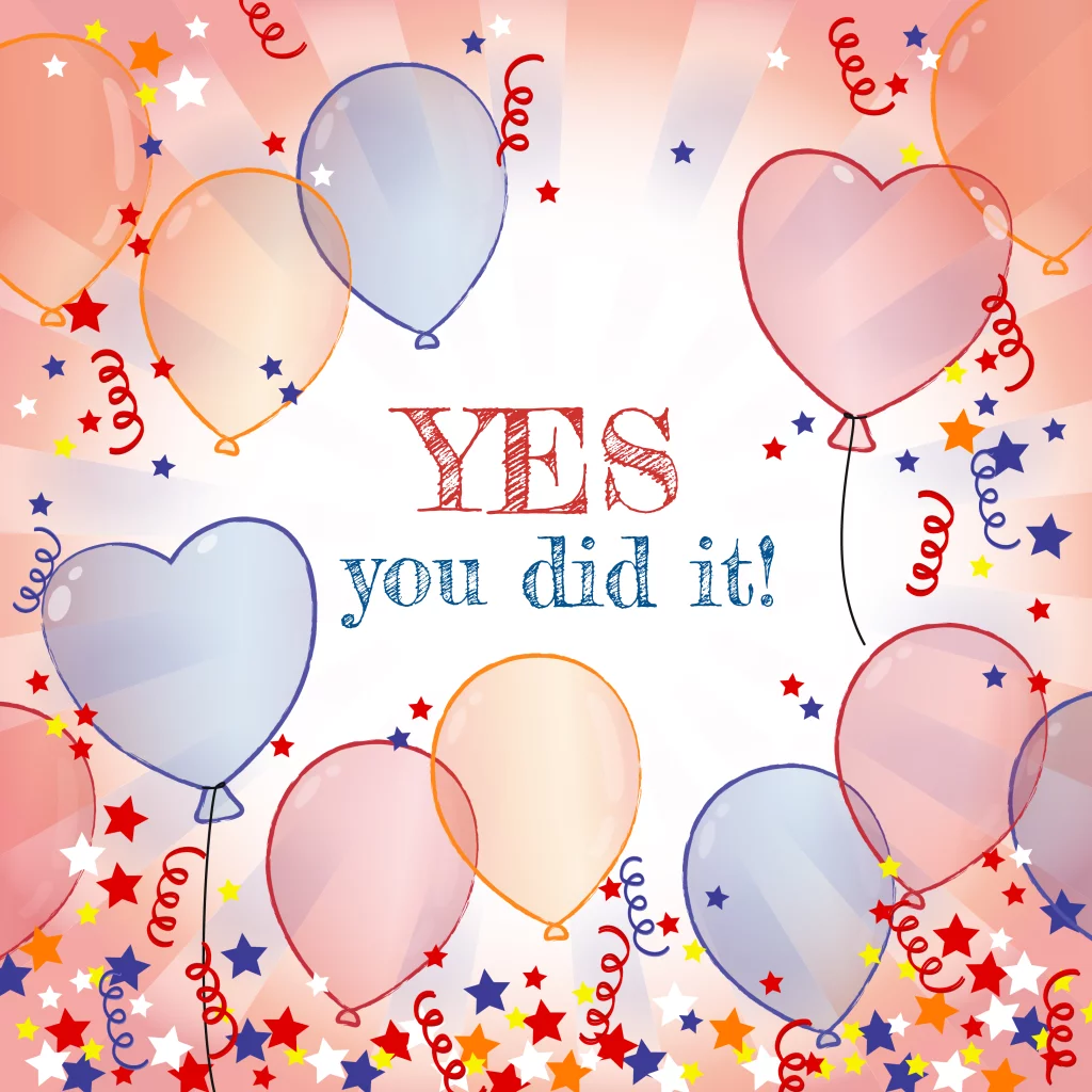 Feestelijke felicitatie kaart voor de geslaagde! YES! You did it! Vrolijke wenskaart met ballonnen en confetti in de kleuren van de Nederlandse vlag. Pas de kaart naar wens aan en feliciteer de geslaagde met een echte kaart in de brievenbus.