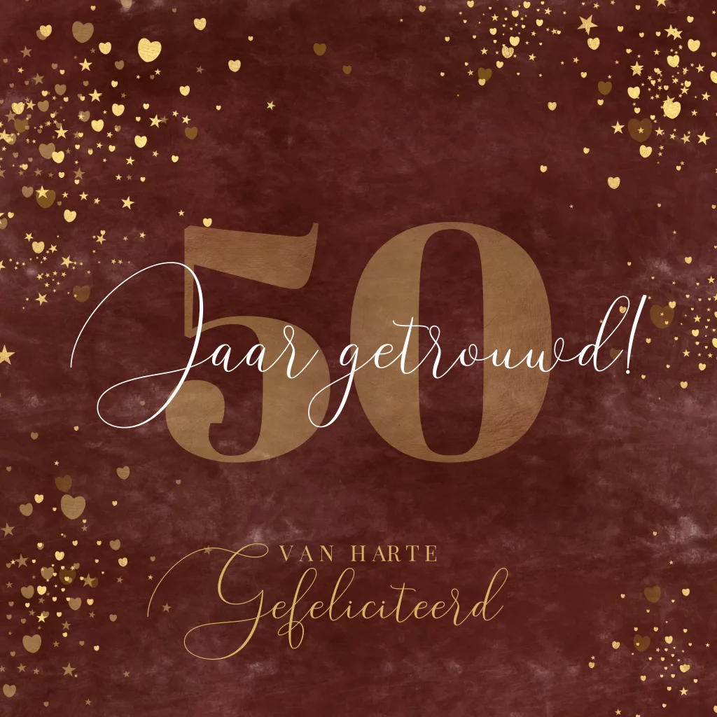 Felicitatie Jubileum 50 jaar getrouwd stijlvol en feestelijk. Deze feestelijke felicitatie kaart heeft een trendy bruin- roze kleur met vele goud kleurige hartjes en sterren. Plaats eenvoudig een persoonlijke tekst op de kaart en verras het bruidspaar met een kaartje in de brievenbus.