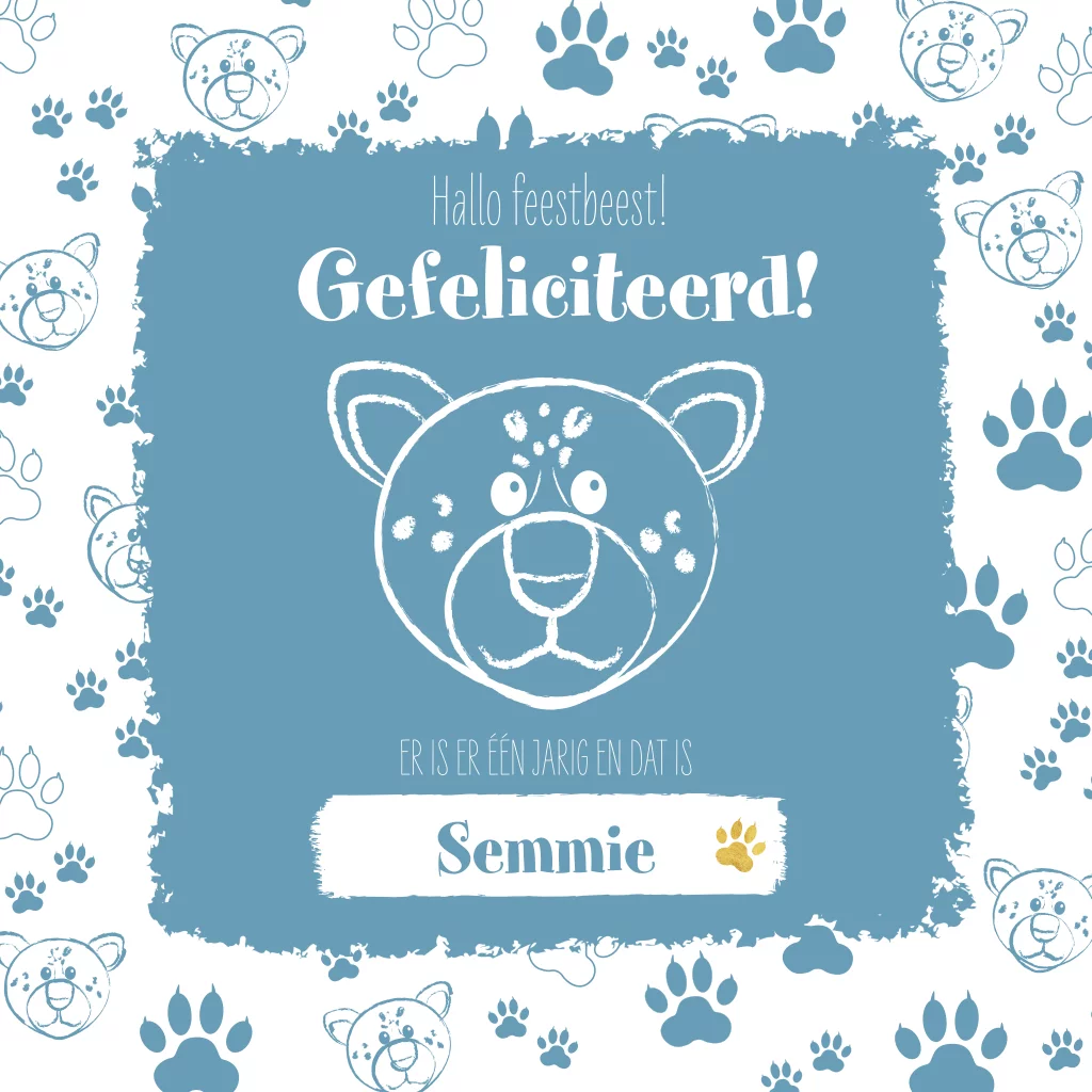 Coole verjaardagskaart met een sjabloon vol panters en pootafdrukken. De kleur van het blauwe vlak en sjabloon kan gemakkelijk worden aangepast. Pas de naam in de witte balk aan voor de naam van de jarige en maak jouw kaart zo extra persoonlijk.